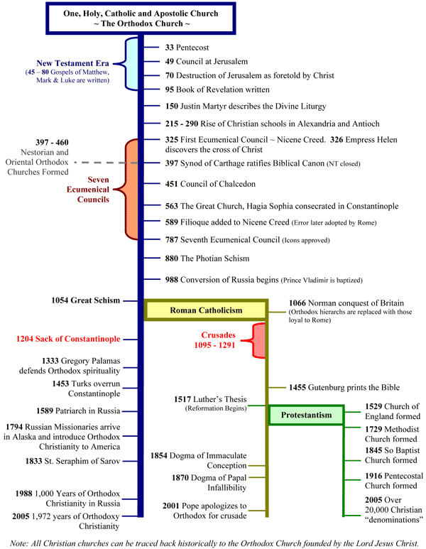 As shown in the timeline on the right, the Christian church remained essentially united through the early councils. Then, one word (Filioque) caused the Great Schism of 1054 and the ‘orthodox’ church began splitting into more and more denominations.