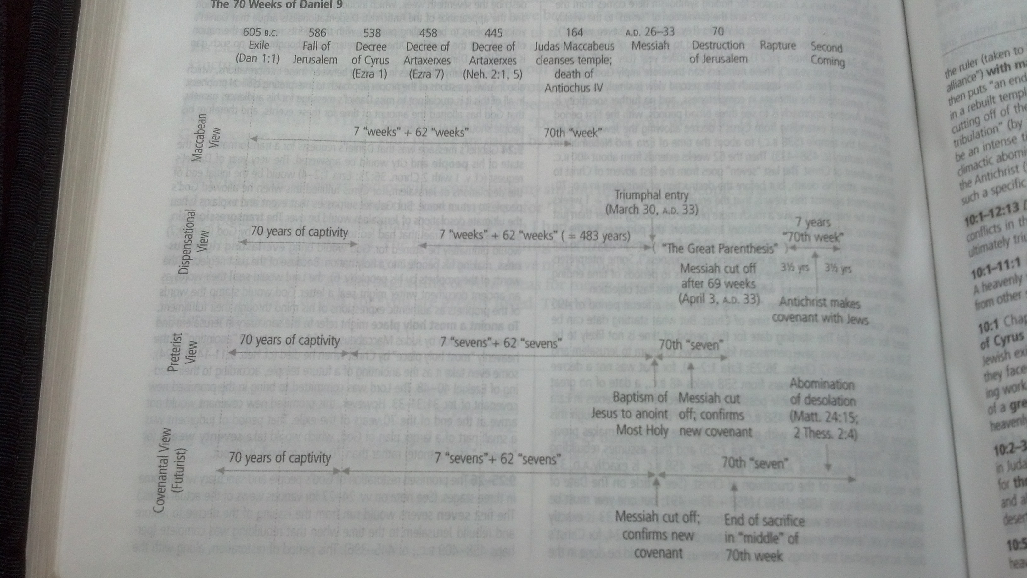 - Where does one start in trying to get a handle on Daniel’s “Seventy Weeks?” I would recommend finding a good study Bible, that is not committed to following one particular view. To try to simplify things (an almost impossible task), I took the following snapshot from my ESV Study Bible (highly recommended!!) that lays out some of the major viewpoints in a very concise diagram, including the Maccabean view (adopted mainly by critical scholars), the Dispensationalist/Futurist view (what Ken Petzinger’s work is based on), the Preterist view (all of the “seventy weeks” prophetic elements have already been fulfilled), and the Covenantal/Futurist view (the dominant view throughout church history until the rise of Dispensationalism in the 19th century). Note the different start and stopping times on the date calculations, along with the indications of any “gaps” within the prophetic timetable (click on the image to enlarge so that you can read it!!):