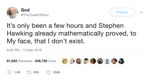 I first read his wonderful and amazing A Brief History of Time over a Christmas break, and it still leaves my head spinning. This was Hawking’s 1988 blockbuster popular science book, that sought to put heavy-duty concepts like the Big Bang, gravity, and the nature of time down on the bottom shelf. During those days, Hawking indicated that the laws of physics “may have been decreed by God, but God does not intervene to break the laws.” But within a few years, Hawking began to change his tune: “It is not necessary to invoke God to … set the universe going.” By 2011, he made this statement on a Discovery Channel documentary, “We are each free to believe what we want and it is my view that the simplest explanation is there is no God. No one created the universe and no one directs our fate.”