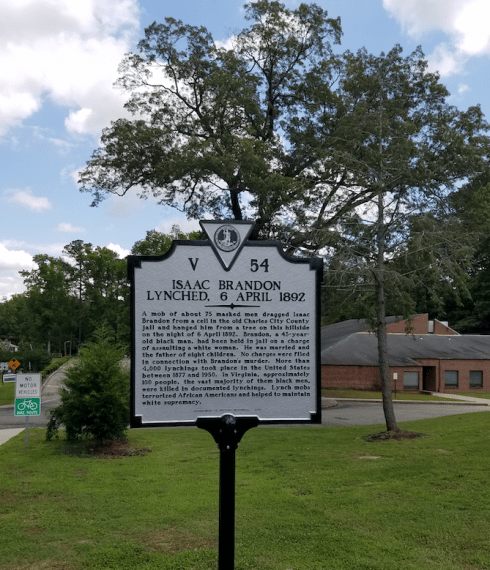 On my bike ride today, I rode near the Charles City County, Virginia courthouse. Charles City County is one of the oldest communities, founded by the English in the early 17th century. It is also home to several stately plantations, that dot along the James River, a few of which are open to visitation today. These plantations were supported by hundreds of African American slaves, whose descendants make up the majority population in the county. Below is a photograph I took of the Confederate war memorial, with the newer courthouse building in the background. Below that is another photograph, taken only a few hundred feet from the courthouse, where Isaac Brandon, an African American with a wife and eight children, was awaiting trial, after being charged with assaulting a white woman. Brandon was taken from the jail and lynched by a white mob, in 1892, on a tree, on this hillside. No one from the mob was ever charged or arrested for their activities.