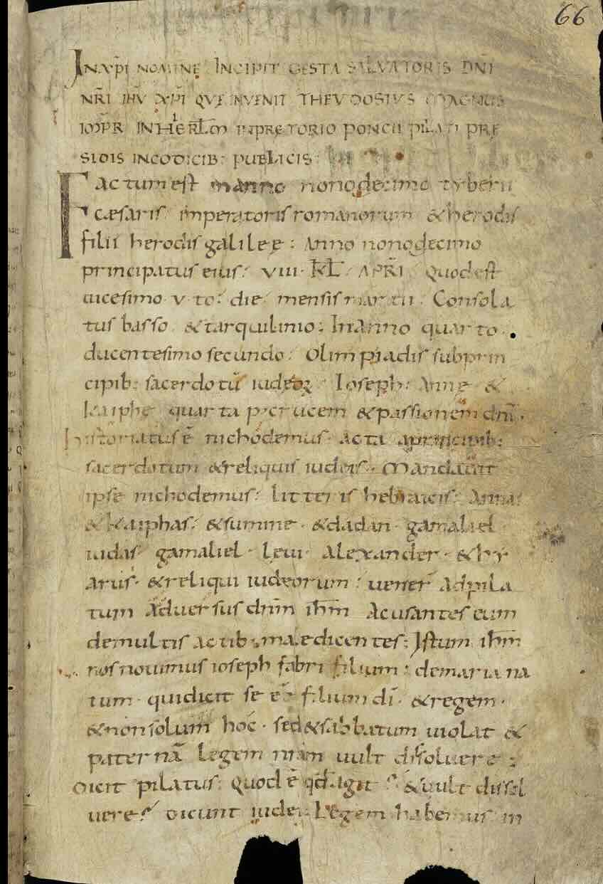 A 9th or 10th century copy of the Gospel of Nicodemus, sometimes called the Acts of Pilate, in Latin.