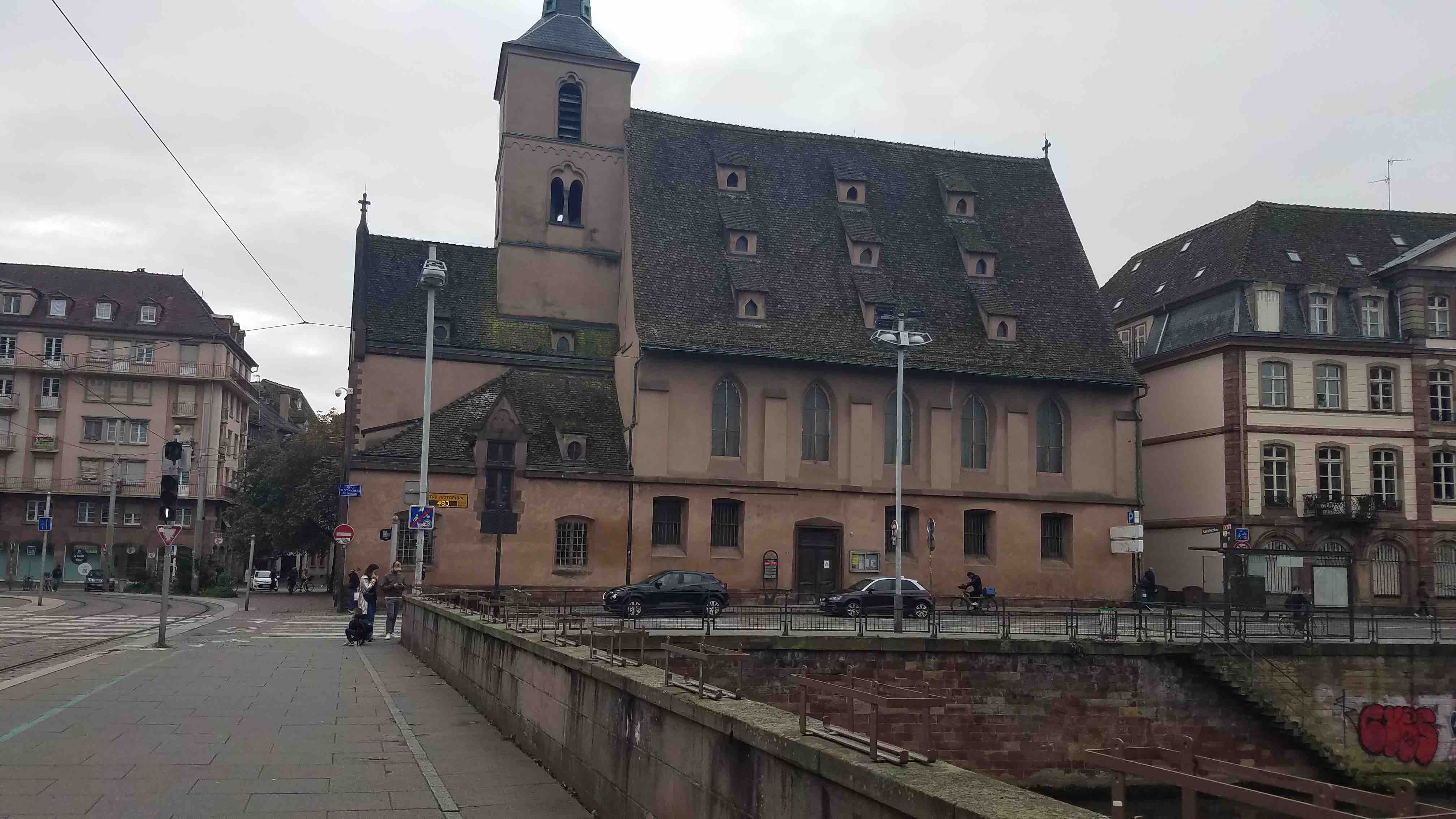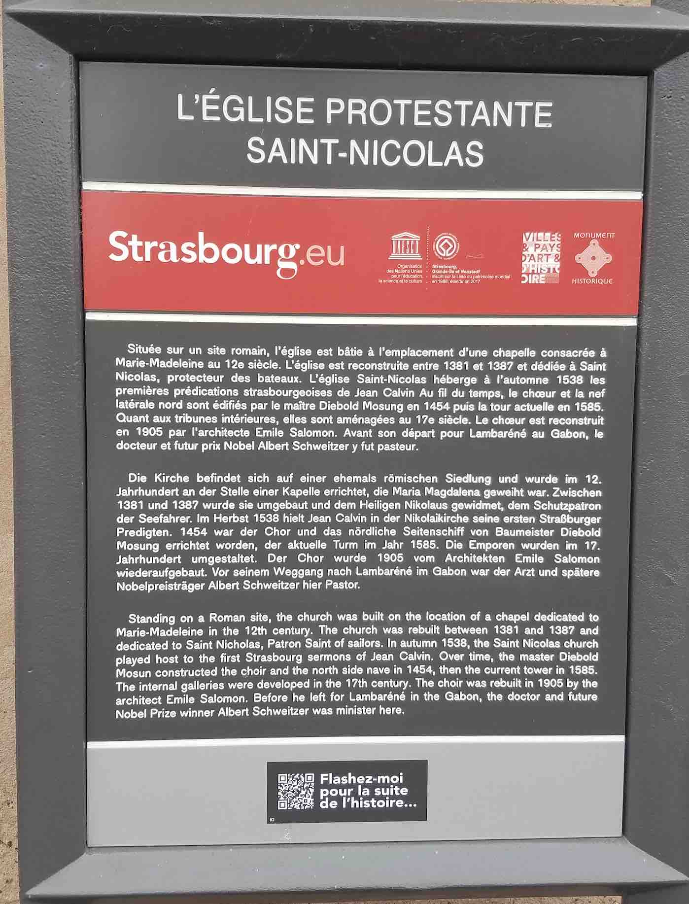 In the early 20th century, Albert Schweitzer preached in Saint Nicholas Church, in Strasbourg, the same church the 16th century Protestant Reformer, John Calvin, preached in a few hundred years before. Calvin’s flock was made up of Protestant refugees fleeing religious persecution in France. After Schweitzer was in Strasbourg, Schweitzer changed the course of his life, giving up evangelical preaching for a life of service as a missionary doctor in Africa. My wife and I visited Strasbourg in October, 2025, and discovered this church. From where I was standing, I could not get the full steeple of the church building in this photo!