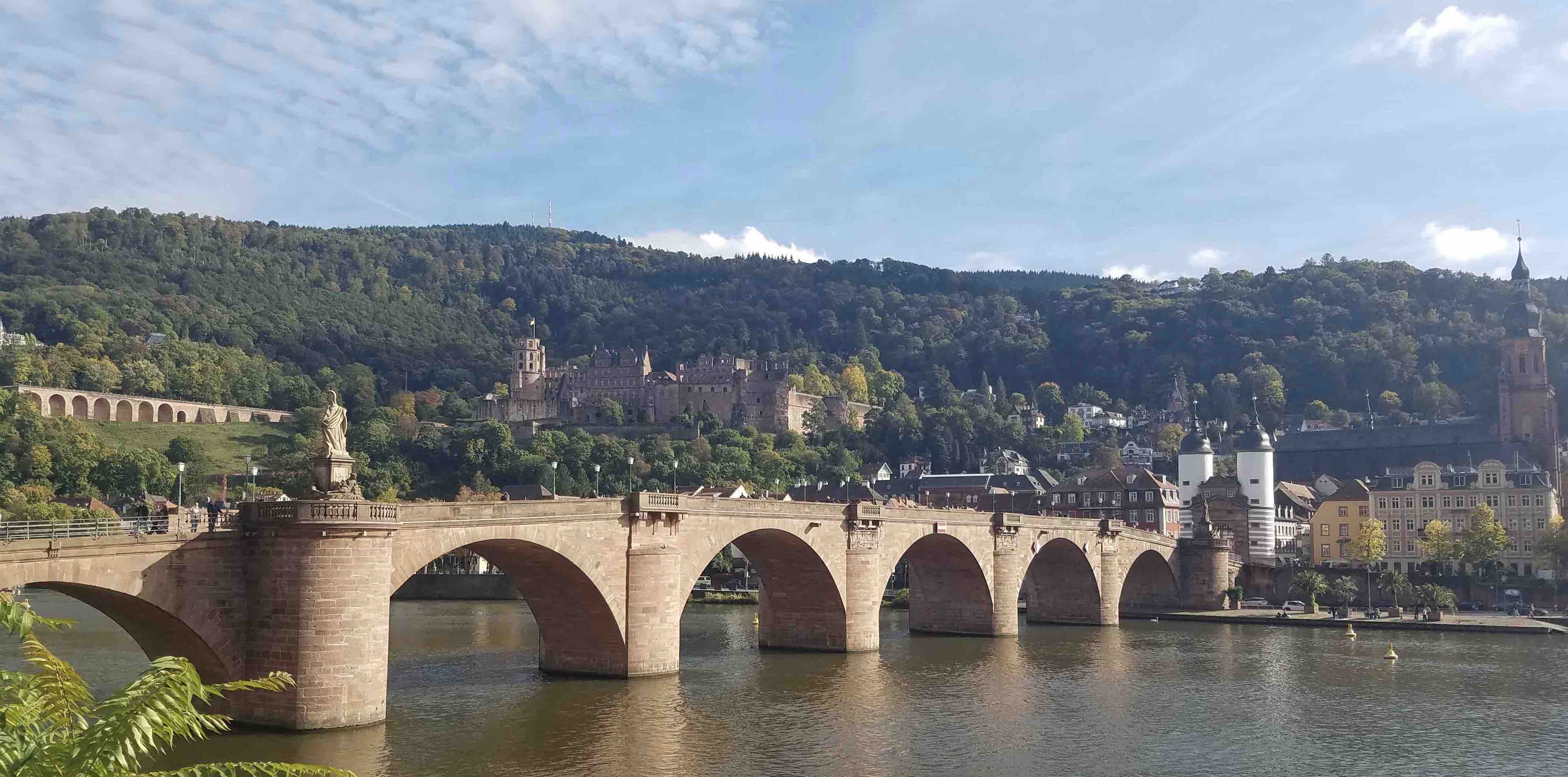 The old bridge crossing the Neckar River, in Heidelberg, Germany, with the famous castle above.