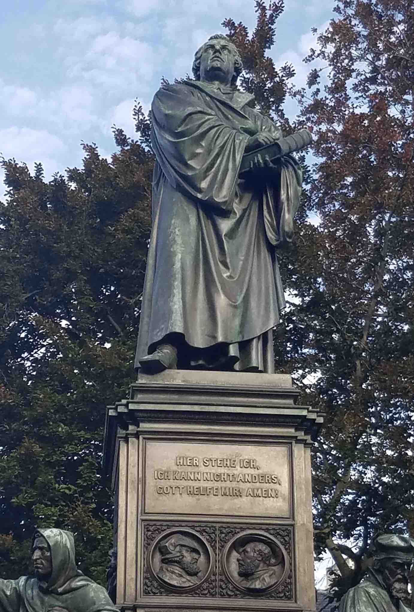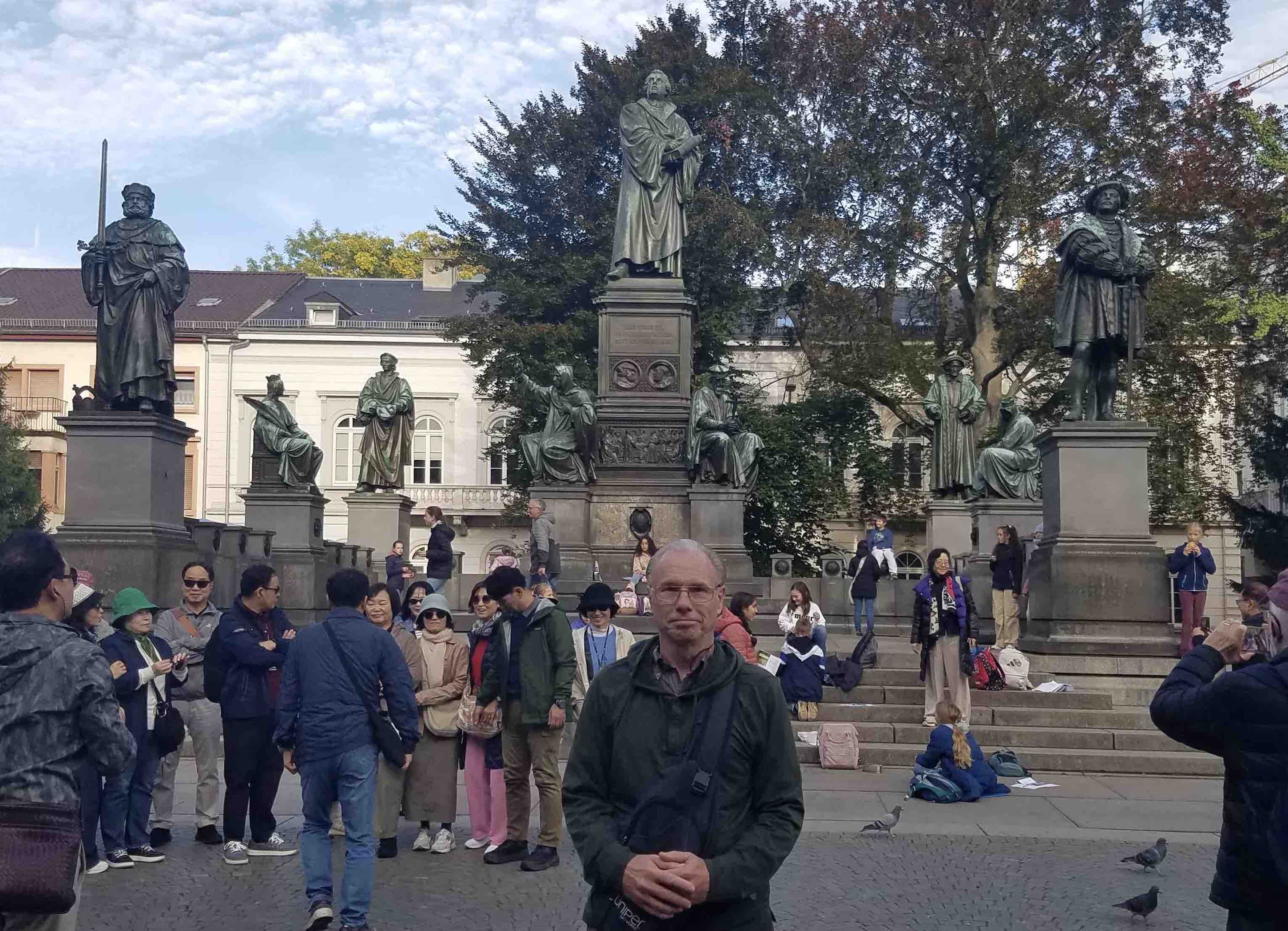 A statue in Worms, Germany, of Martin Luther, the hero of the Reformation…. and a thorn in the flesh to the medieval church establishment. My photo, October, 2025.