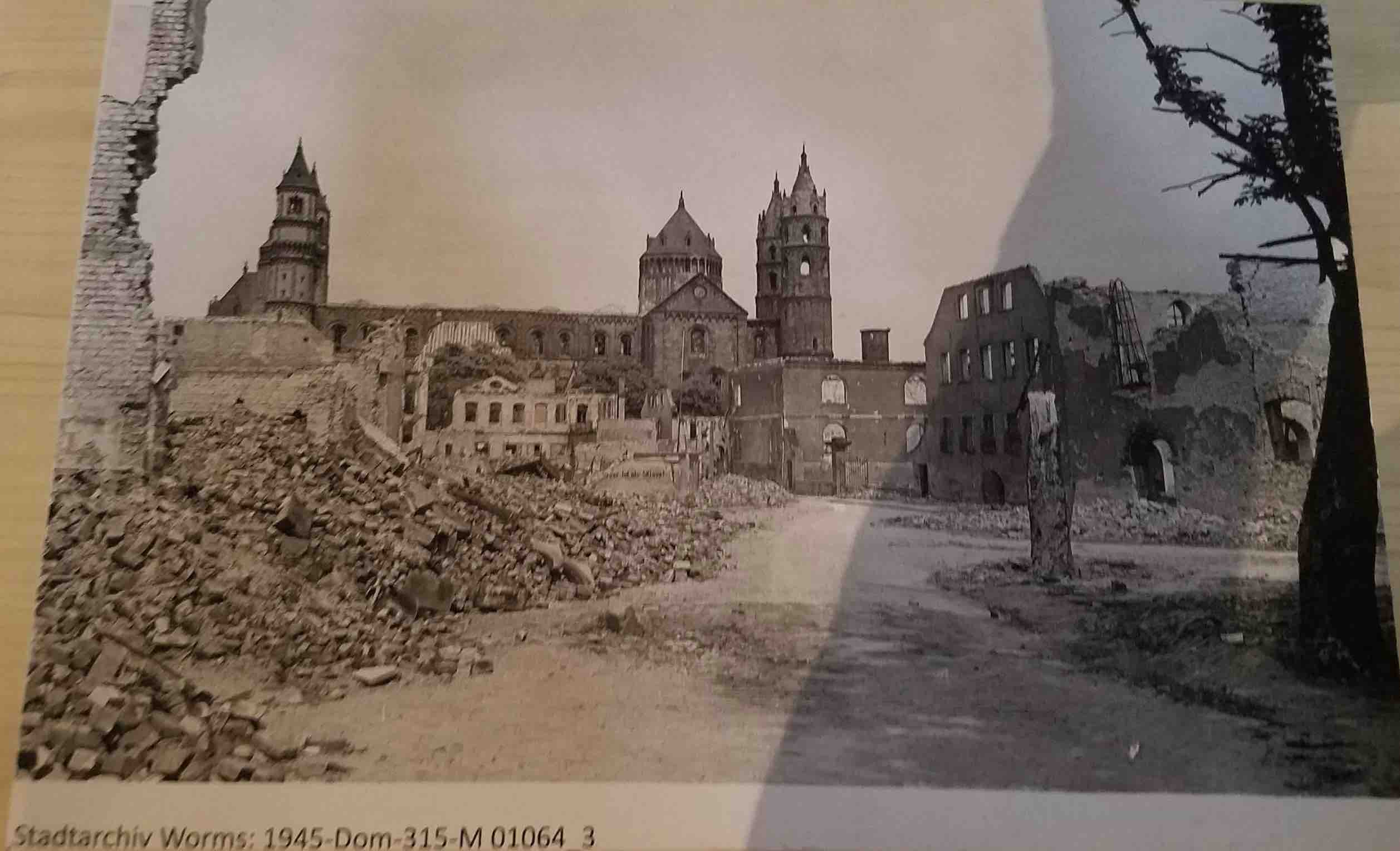 The area around the cathedral in Worms, Germany, not long after the American bombing raids towards the end of World War 2. Photo preserved inside the cathedral, where I took a snapshot of it.
