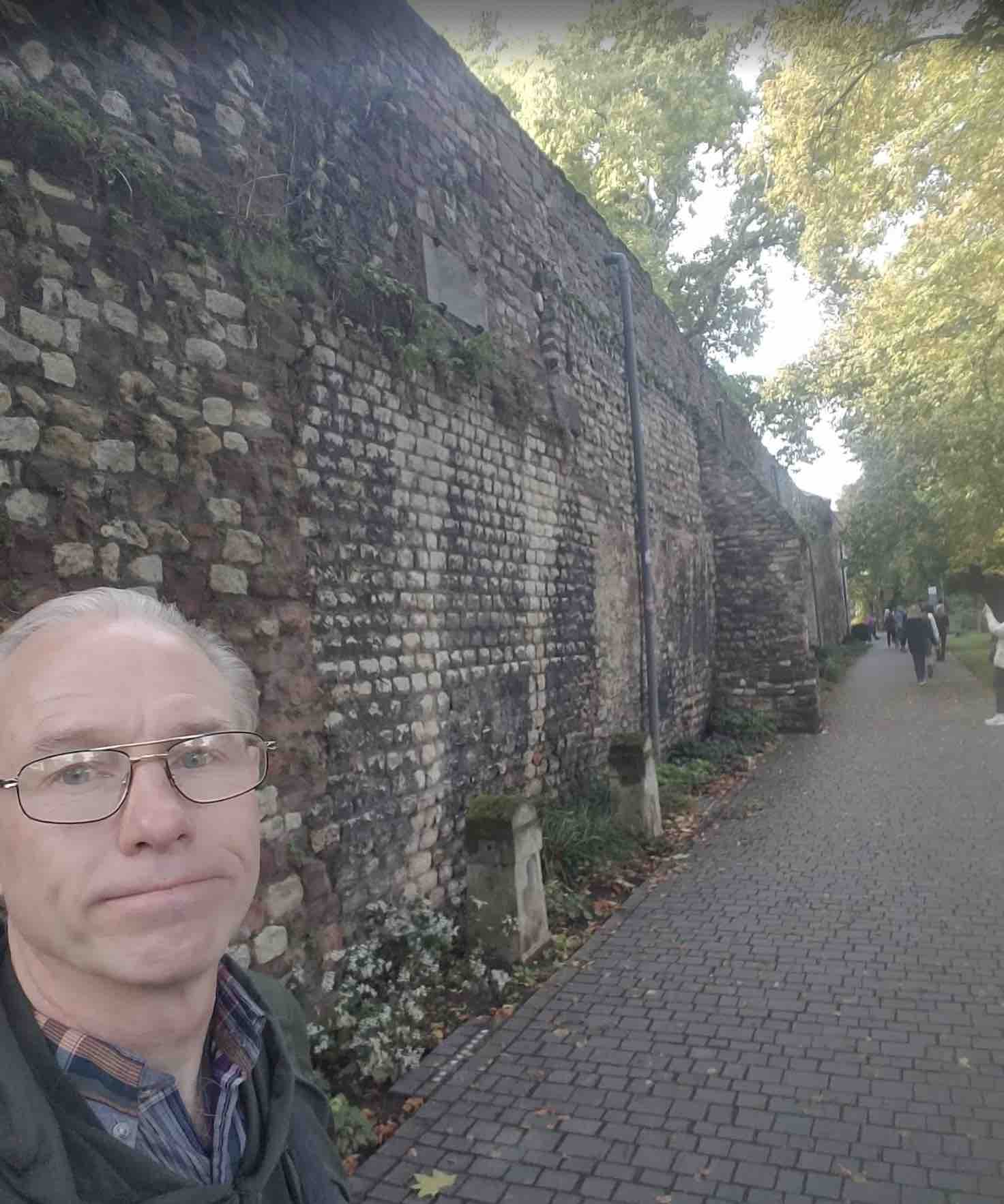 Ancient city wall of Worms, Germany, built by the Romans, about the time of Christ. A moat surrounded the city, fed from the waters of the Rhine. But now it is just a sidewalk and a city street. My photo, October, 2025.