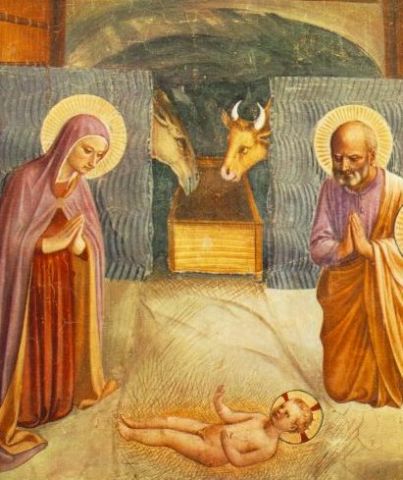 A close-up of part of Fra Angelico’s fresco, in Florence, showing the ox and ass peering in from behind their stalls, to catch a glimpse of the baby Jesus.