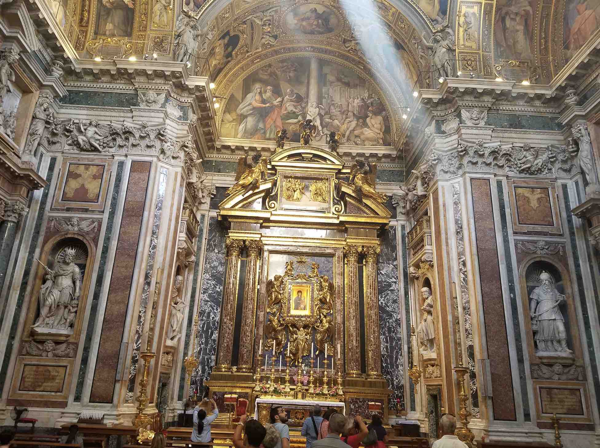 One of many side chapels in Santa Maria Maggiore, a beautiful church in Rome, Italy, dedicated to the Virgin Mary, from our trip to Rome in 2018. Though a little difficult to see, another photo linked here of the Triumphal Arch at the church shows Mary, as told by the Protoevangelium of James, with a scarlet thread she used to spin to help make the curtain of the Jerusalem Temple, in the top left mosaic. A dove representing the Holy Spirit is above her head, showing the Annunciation as described in Luke 1:26-38.