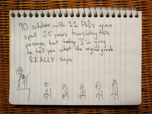 I ran across this comic today, posted in an excellent piece by Andy Naselli, a New Testament instructor at Bethlehem College & Seminary, founded by Minneapolis pastor, John Piper. Naselli’s argument is that while many Christians tend to argue that their favorite Bible translation is the best, and every other translation is inferior, it would greatly help if we had some humility here.