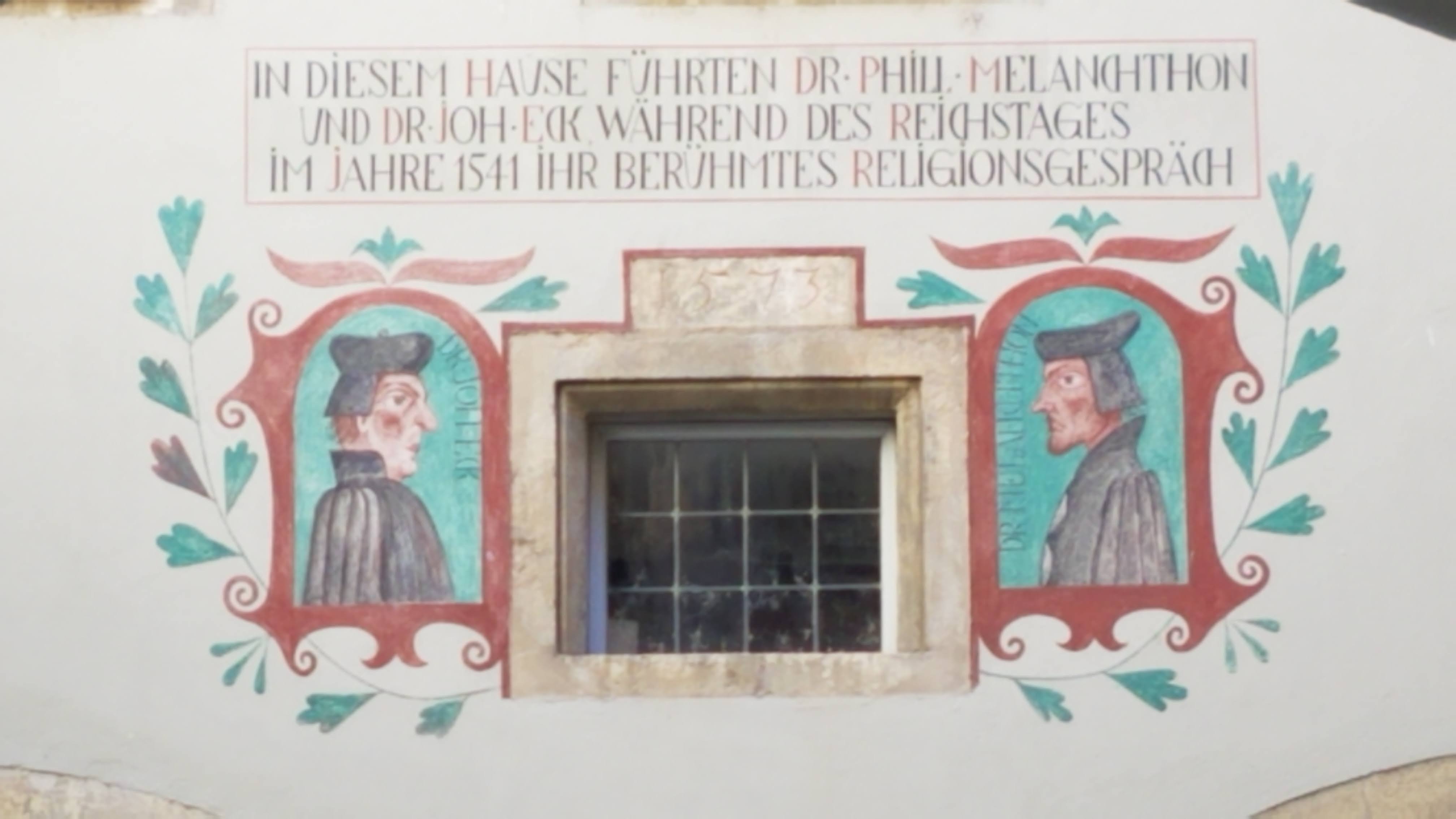 Zooming in on the photo above: Roughly translated, the wall painting which features Melanchthon and Eck on either side reads: “in this house doctor phil melanchthon and doctor johann eck led their famous religious discourse during the imperial diet in 1541”