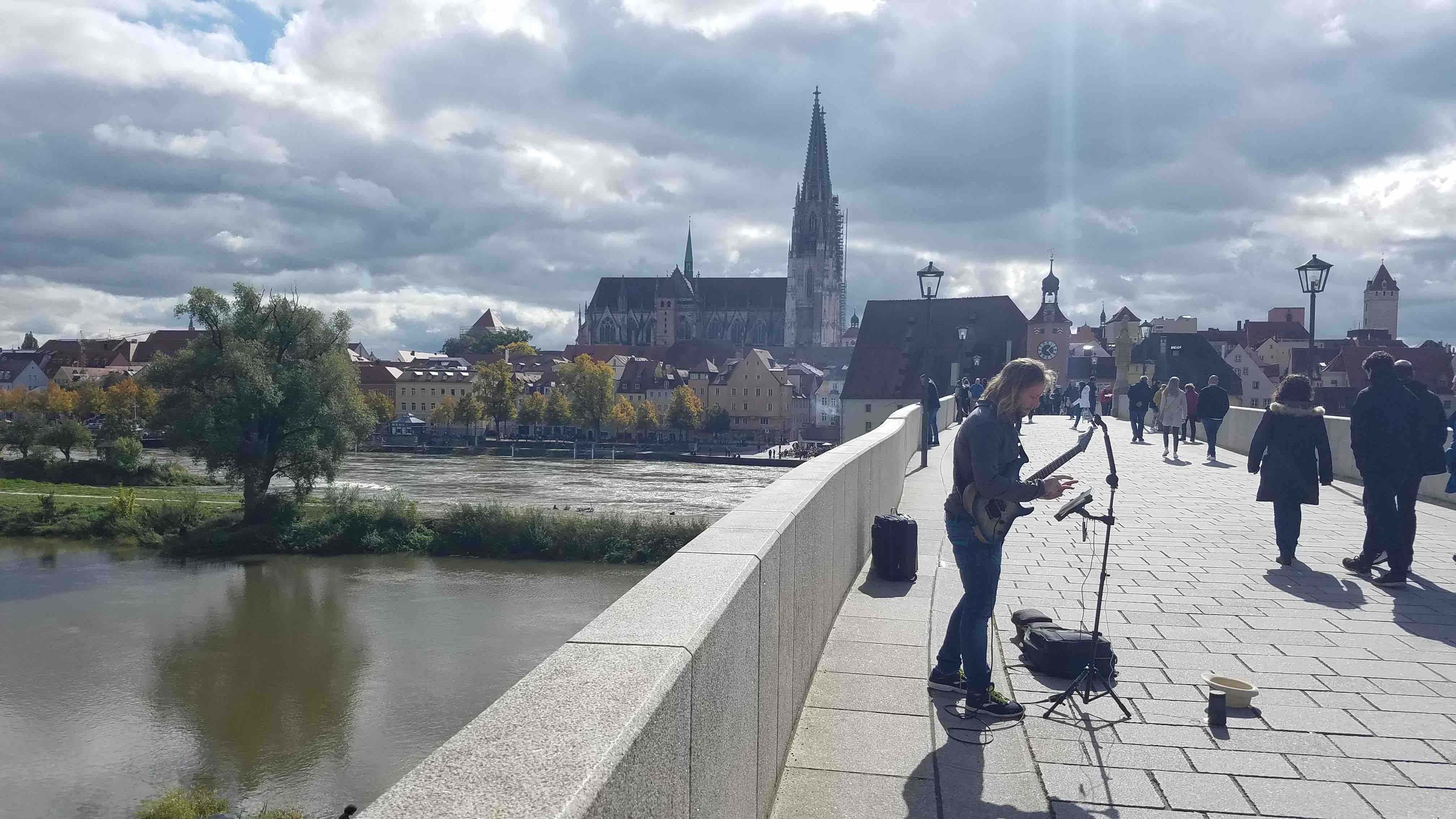 Crossing over the Old Stone Bridge, looking towards the old city center of Regensburg. Hundreds of tourists, mainly from the Danube-Rhine cruise ship industry, were in town the day I snapped this photo, and listened to this street musician crank up his battery-operated guitar outfit to play Led Zeppelin songs.