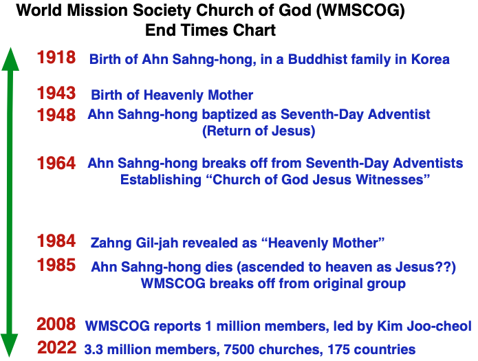 What makes it even more complicated is that back when Ahn Sahng-Hong was still alive, he never considered himself to be the Second Coming of Jesus, nor did he accept the revelation of Zahng Gil-jah as the “Mother of God,” or “Heavenly Mother.” Instead, Ahn Sahng-Hong dismissed the whole “Heavenly Mother” teaching to be complete nonsense, something that went way beyond his 1984 revelation, and he also taught that the Second Coming of Jesus is still yet a future event. The smaller splinter group, the New Covenant Passover Church of God, still holds to these alternative teachings.